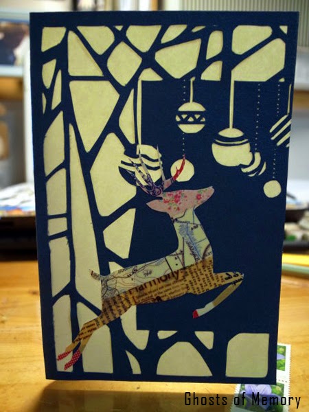 上面是卡片的版型,左邊的鹿是網路上可以找到的圖。右邊的背景的樹枝也是從矢量素材中下載的。至於聖誕燈飾就是在Photoshop笨拙地使用滑鼠完成的。製作好草稿後就開始刻刻刻,刻到天涯海角的步驟。