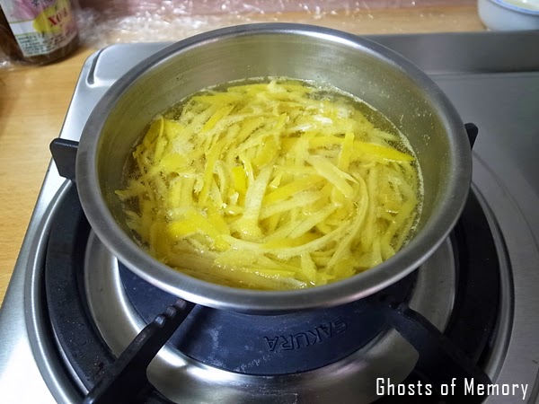 將檸檬皮放入裝了冷水的鍋中,沸騰後瀝乾稍微靜置一下。